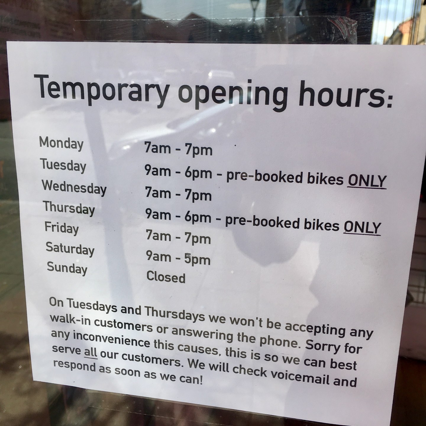 This is to make sure we have enough mechanics in the shop at busier times during the day, and to deal with the extra time needed to serve one customer at a time at the door. Basically, to make sure there are enough of us to go round! Thanks for your patience.